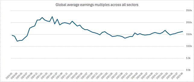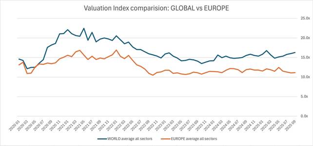 Our data shows the global earnings multiple across key sectors of the world economy rose steadily over the summer to reach 16.3x EBITDA by September 30. In contrast, the average multiple for companies in Europe was just over 11x.